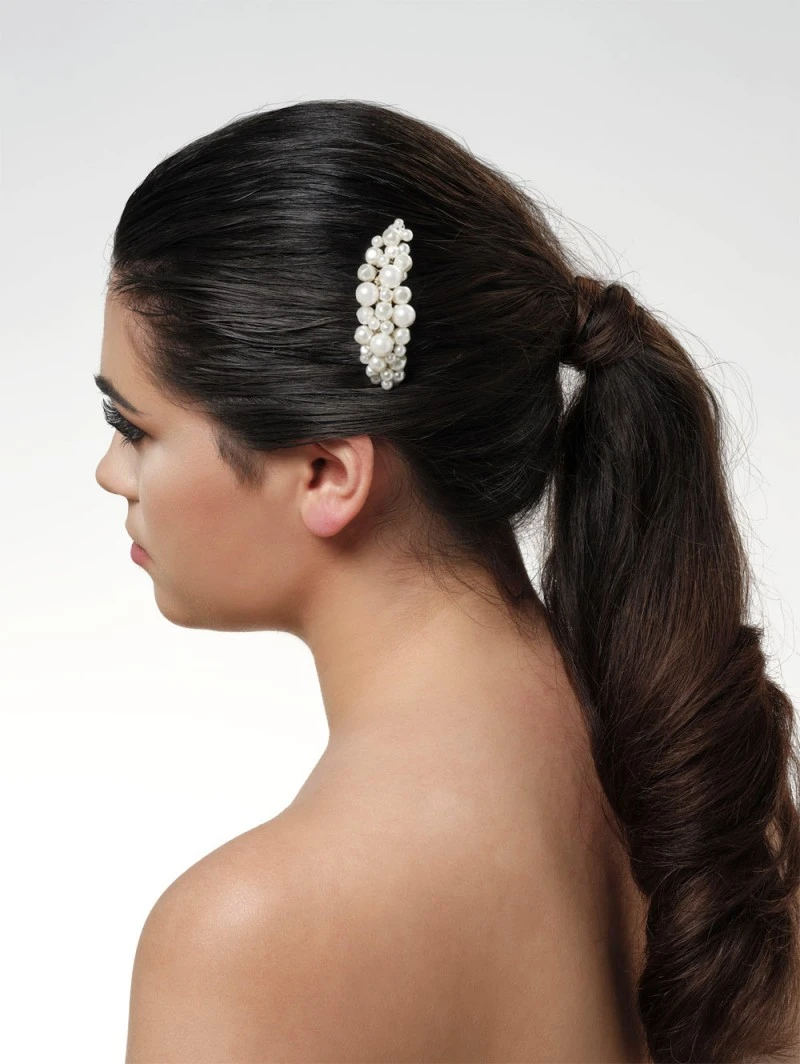 Details: ivoorkleurige halvemaanvormige haarversiering, zoetwaterparels, ronde parels, goudkleurige kam