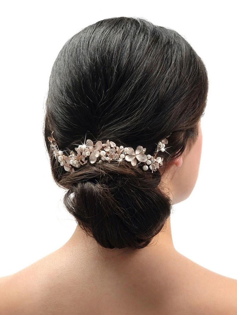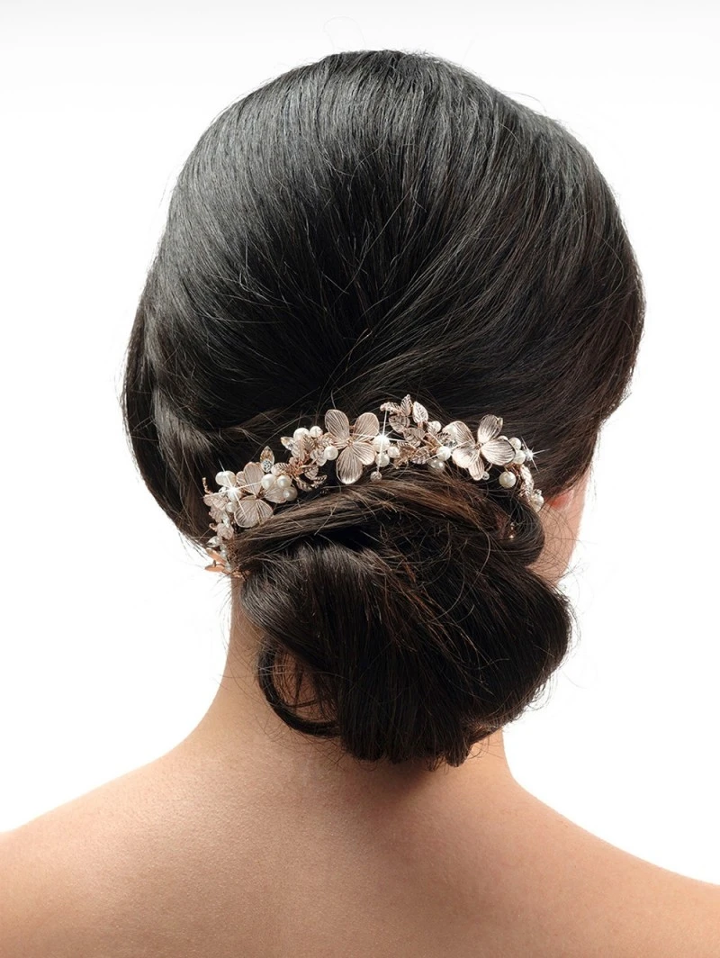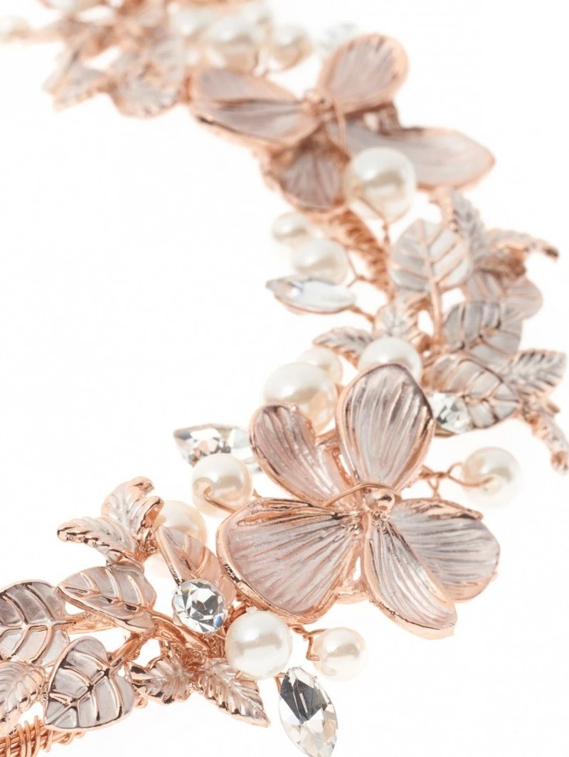Details: roségoudkleurig flexibel haarornament; roségoudkleurige bloemen, parels, strass, kristallen