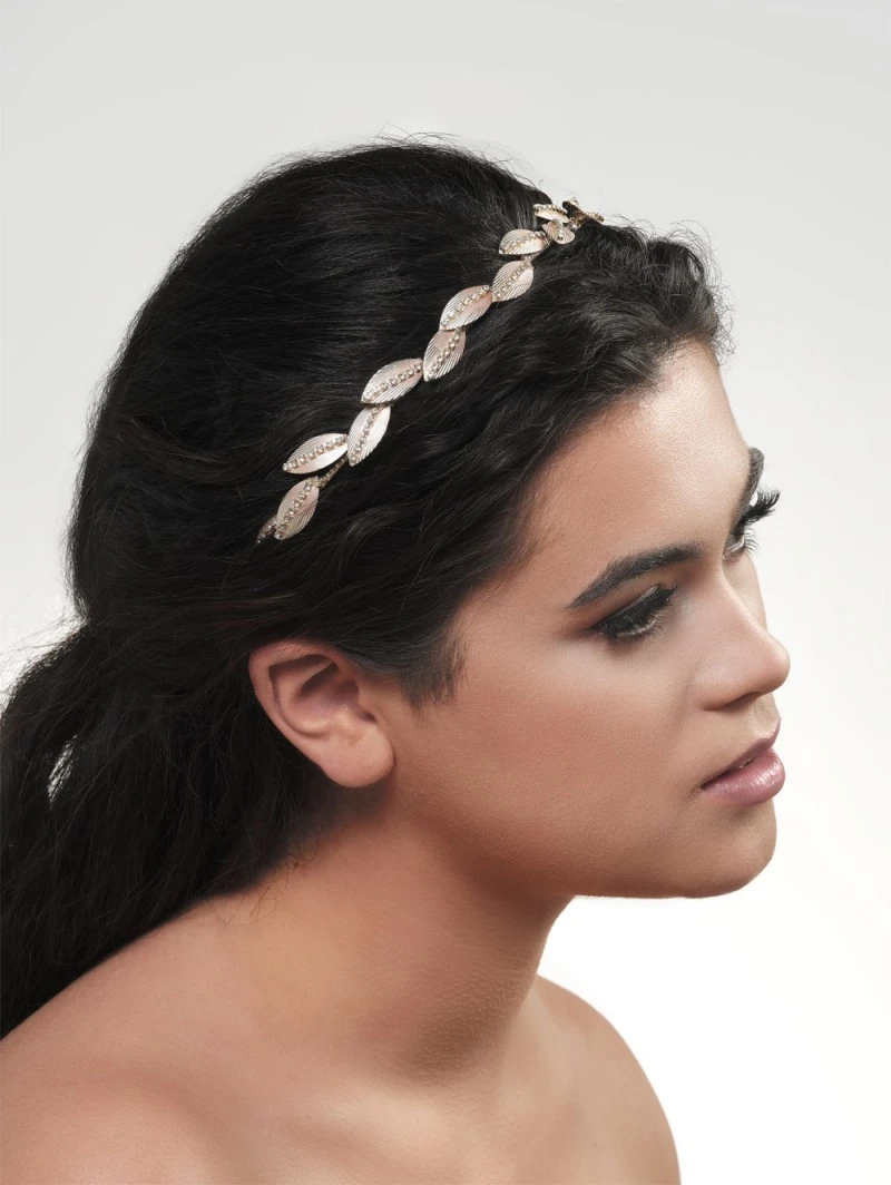 Details: Gouden tiara met rosébladeren met kleine strass-steentjes in het midden van de bladeren