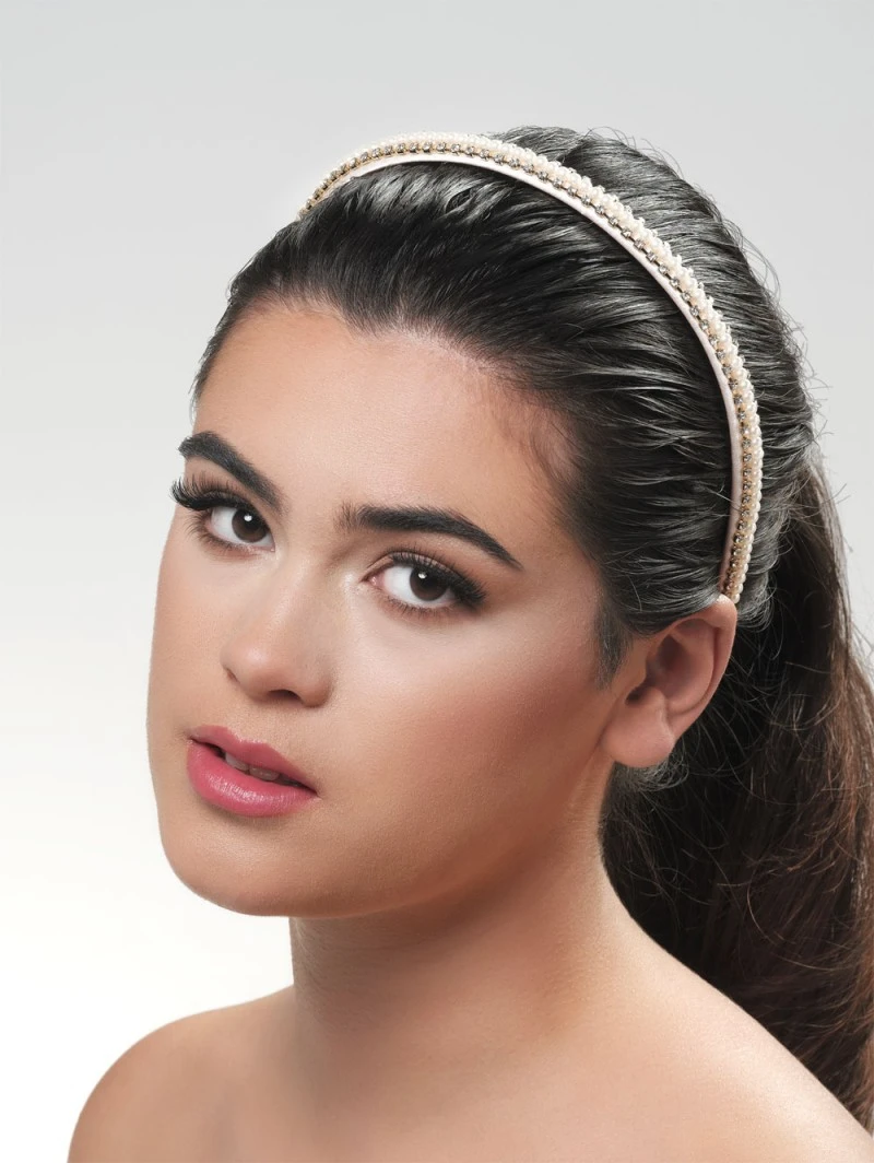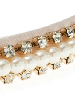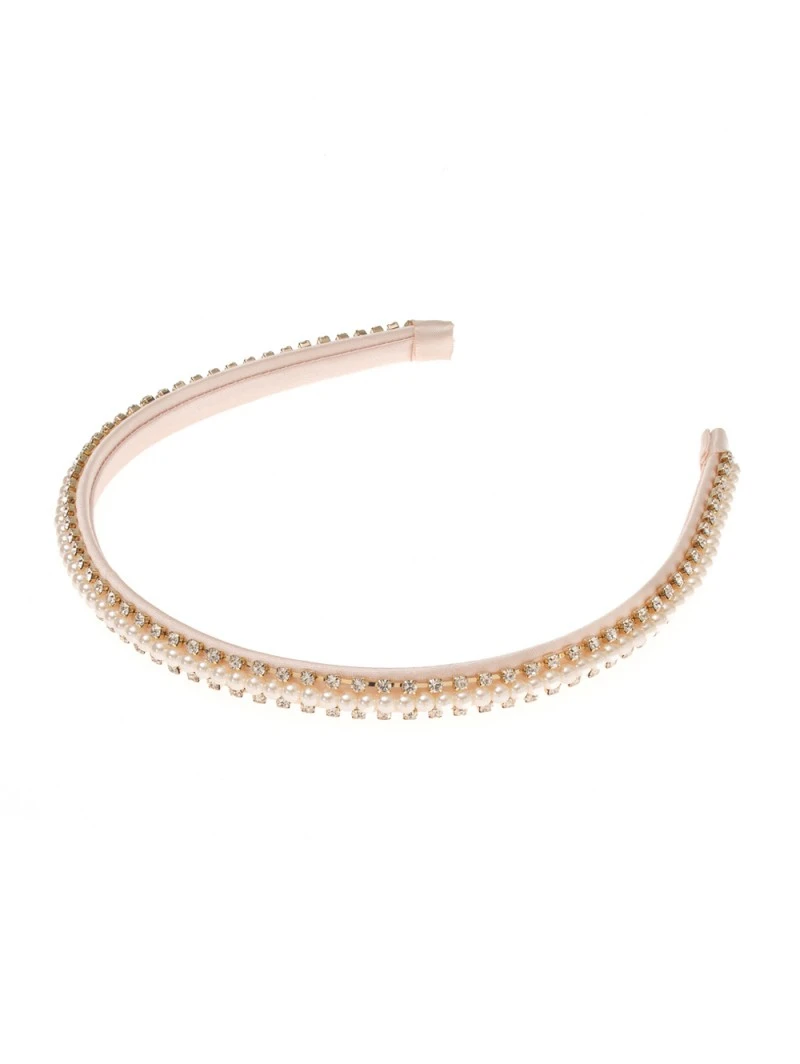 Tiara details: Ivoor- en goudkleurige tiara met een combinatie van strass steentjes en een rij van ivoren parels in het midden