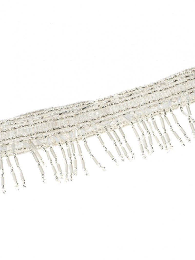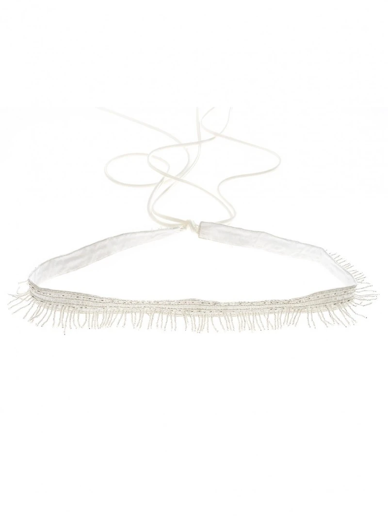 Materiaal: Ivoorkleurige stoffen ceintuur, franjepatroon van ivoor- en zilverkleurige kraaltjes