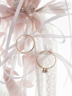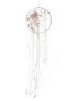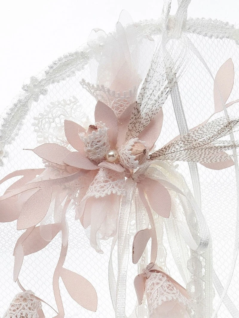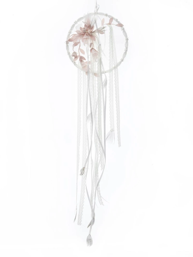 Details: ivoorkleurig ringkussen in de vorm van een dromenvanger, blushkleurige bloemen, veren