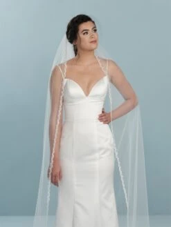 Sluierrand: geborduurde fijne kant, pailletten en parels