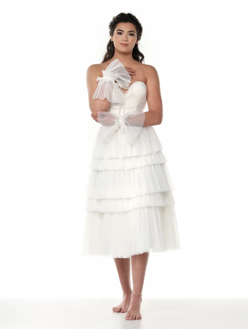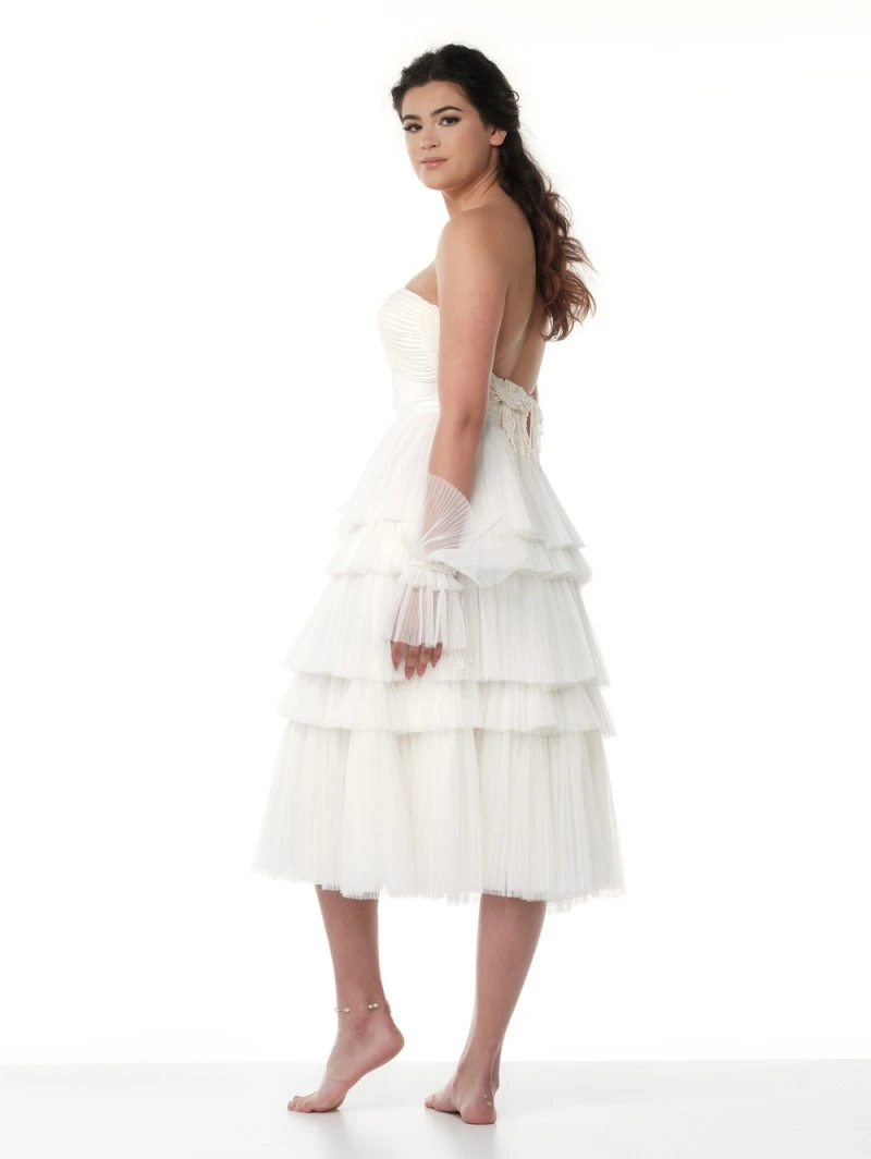 Details: korte ivoorkleurige bruidsrok met geplooide stroken en matte satijnen tailleband