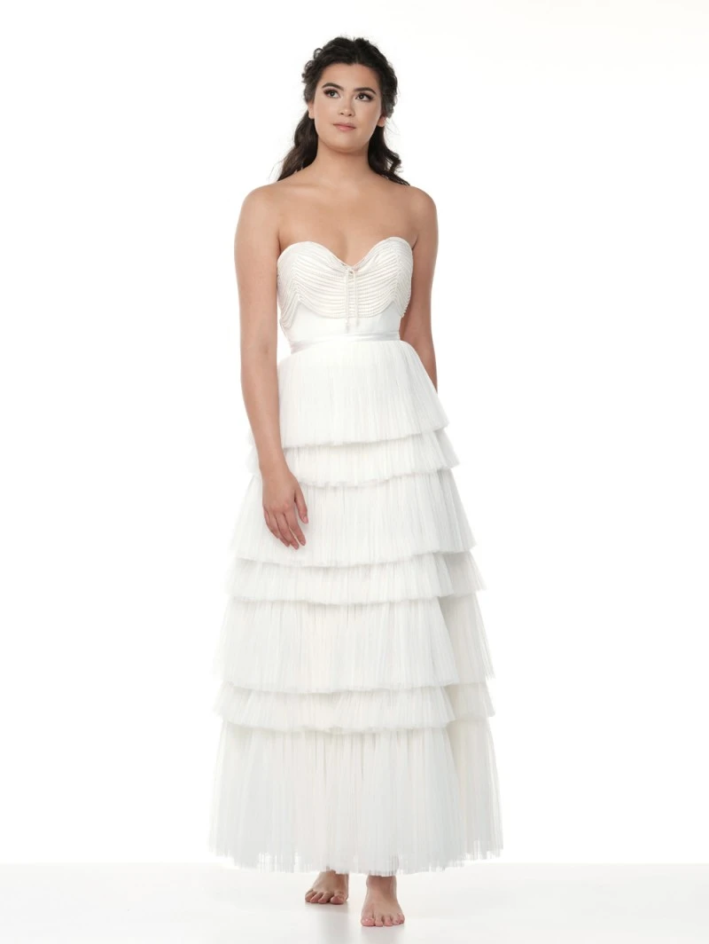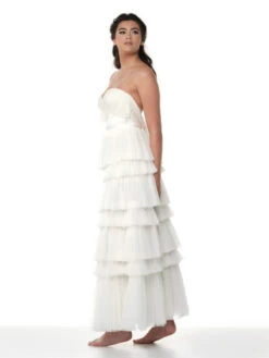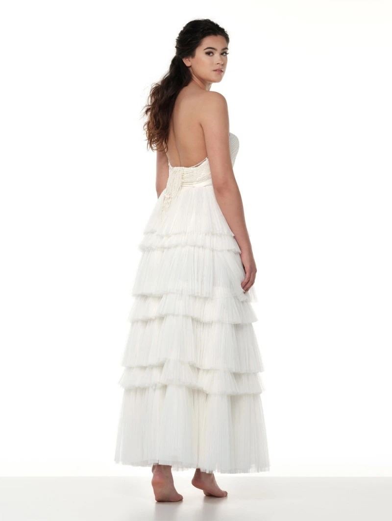 Details: lange ivoorkleurige bruidsrok met geplooide stroken en matte satijnen tailleband