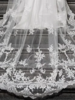 Prachtige enkellaags sluier in medium tule van Poirier. De sluier is versierd met geborduurde bloemversieringen en pailletten.
