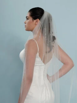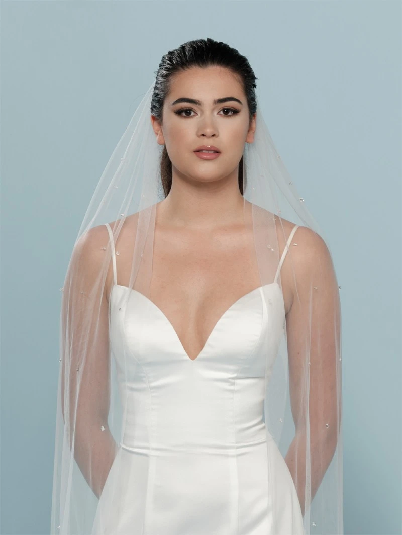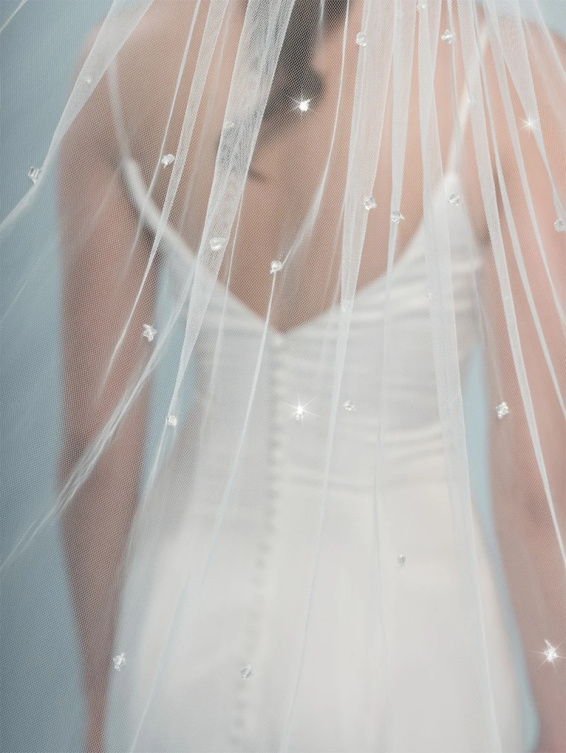 Details: ivoorkleurige soft-tule-sluier versierd met kristallen en strass-steentjes