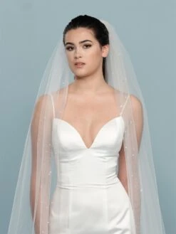 Details: sluier met kristallen, pailletten en geborduurde tekst “Hallo Beautiful”.